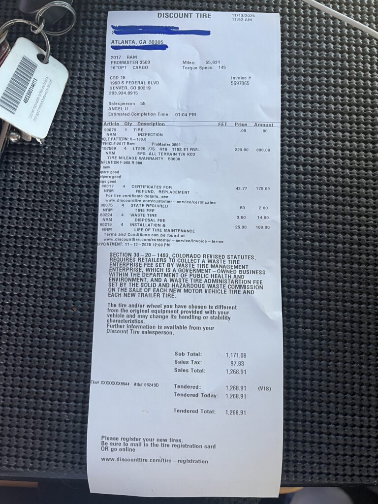 New set of tires in Denver COBy Humming Sparrow / November 13, 2025 From Discount Tire: https://share.google/Jm4SbWiTSbeTfJTiS total cost: $1,268.91 type of tires: all terrain T/A ko3